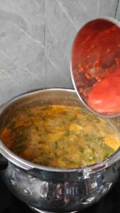 ಕುಕ್ಕರ್ ತಣ್ಣಗಾದ ನಂತರ ಮುಚ್ಚಳ ತೆರೆದು ಅದಕ್ಕೆ ಟೊಮೇಟೊಗಳನ್ನು ಸೇರಿಸಿ. ಟೊಮೇಟೊಗಳು ಸ್ವಲ್ಪ ಮೃದುವಾಗುವವರೆಗೆ ಬೇಯಿಸಿಕೊಳ್ಳಿ. ನಂತರ ಟೊಮೇಟೊಗಳನ್ನು ತೆಗೆದು ಬೇರೆ ಪಾತ್ರೆಯಲ್ಲಿ ಇಟ್ಟುಕೊಳ್ಳಿ.