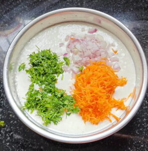 ಈರುಳ್ಳಿಯನ್ನು ಸೇರಿಸುತ್ತಿದ್ದೇನೆ.ಕ್ಯಾರೆಟ್ ಅನ್ನು ಹಾಕುತ್ತಿದ್ದೇನೆ. ಕೊತ್ತಂಬರಿ ಸೊಪ್ಪನ್ನು ಹಾಕುತ್ತಿದ್ದೇನೆ. ಉಪ್ಪು ಮತ್ತೆ ಖಾರಅನ್ನು ಸೇರಿಸುತ್ತಿದ್ದೇನೆ.