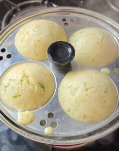 ಈಗ ಇಡ್ಲಿ 15 ರಿಂದ 20 ನಿಮಿಷ ಬೇಯಿಸಿದ್ದೇನೆ ರವೆ ಇಡ್ಲಿ ತಯಾರಾಗಿದೆ ಕಾಯಿ ಚಟ್ನಿ ಜೊತೆ ಸವಿಯಿರಿ.