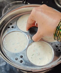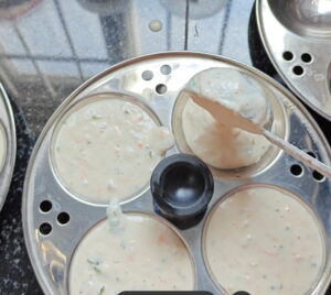 ಈಗ ಇಡ್ಲಿ ಮೋಲ್ಡ್ ಗಳಿಗೆ ಹಿಟ್ಟನ್ನು ಹಾಕುತ್ತಿದ್ದೇನೆ.